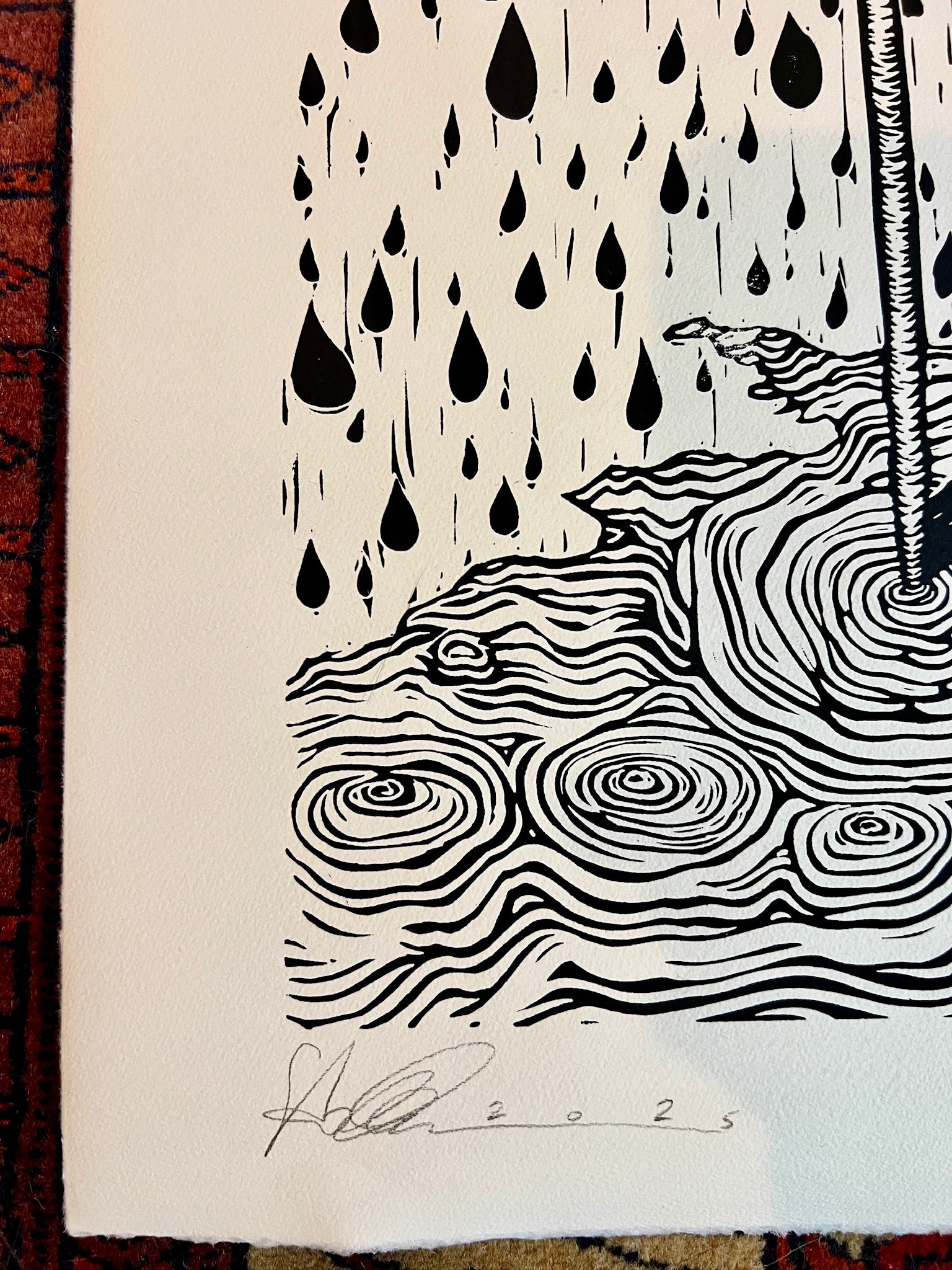 Jeder Linolschnitt ist handgezeichnet und wird anschließend mit speziellem Werkzeug aus der Linoleumplatte geschnitzt.